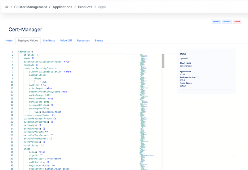The Deployed Values section offers a clear view of all Helm application configurations.