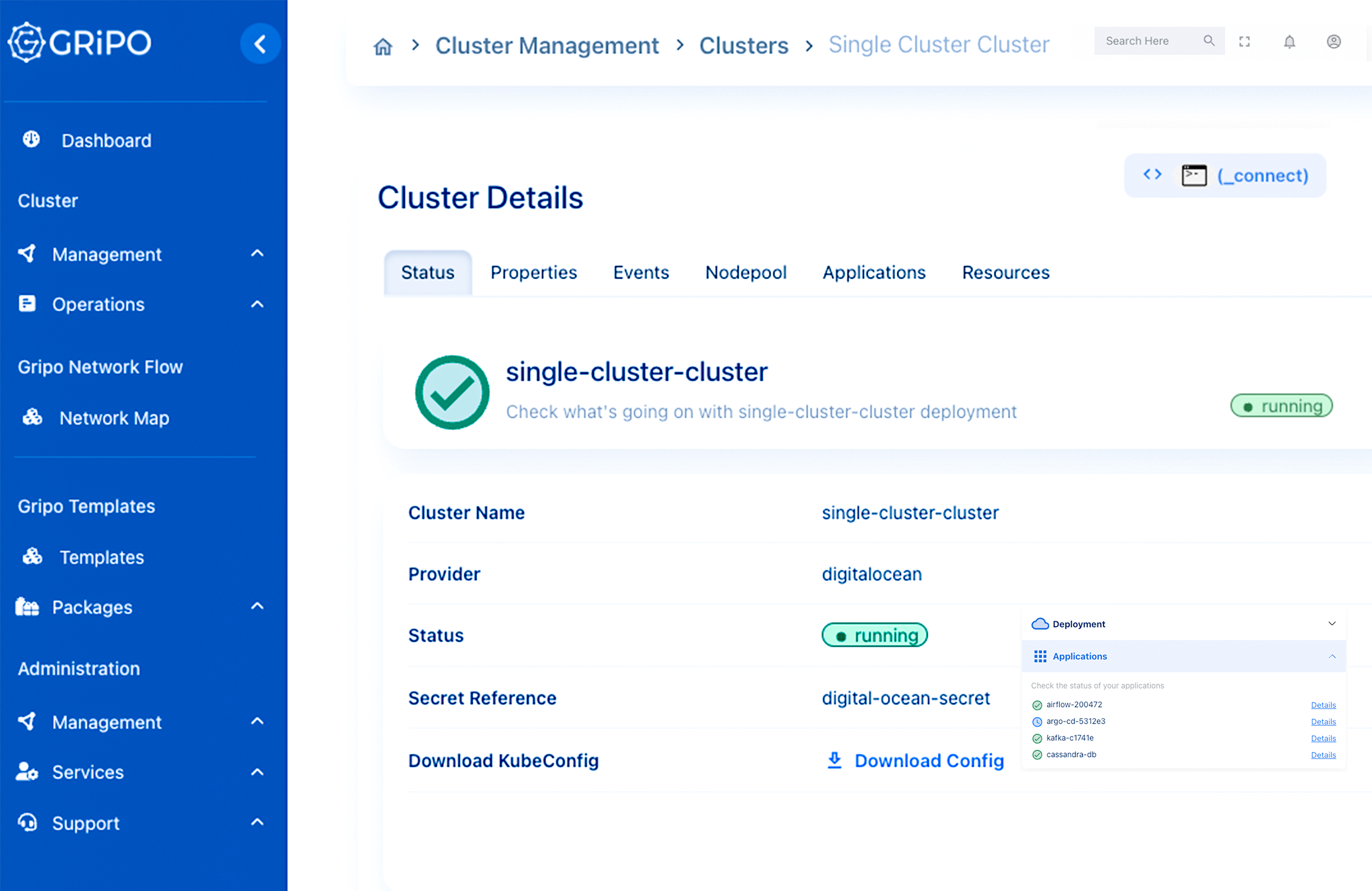 With Gripo, deploying Kubernetes clusters is effortless. Utilize our ready-to-use templates for one-click deployment on AWS, Azure, GCP, or any cloud provider. Simplify infrastructure management and accelerate your deployments.